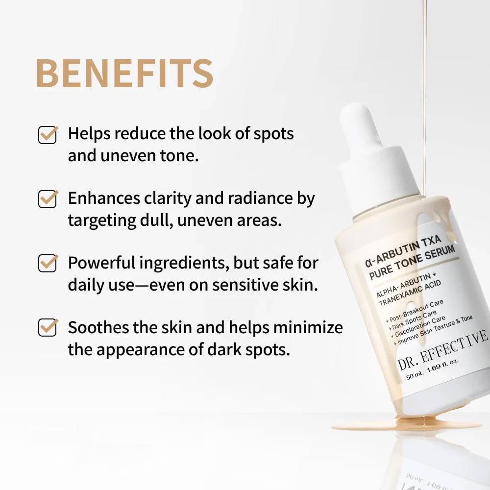 ✨Doble Acción para Claridad y Resplandor Este sérum aprovecha el poder combinado del α-Arbutin y el Ácido Tranexámico (TXA) para trabajar sinérgicamente en tu piel, abordando las causas fundamentales de la tonalidad desigual y las manchas oscuras. Efectivamente mejora la claridad de la piel, restaura su resplandor natural y deja tu complexión más uniforme, juvenil y revitalizada.